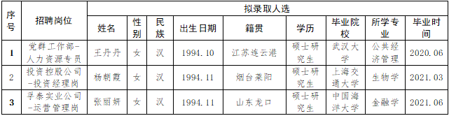 按照2020年8月28日發(fā)布的《2020年煙臺(tái)財(cái)金集團(tuán)面向“雙一流”和全球TOP200高校畢業(yè)生公開(kāi)招聘簡(jiǎn)章》相關(guān)規(guī)定,經(jīng)過(guò)簡(jiǎn)歷收集、資格審查、初試、復(fù)試、集體決策等環(huán)節(jié),擬確定部分崗位錄取人選(詳見(jiàn)下表),現(xiàn)予以公示,公示期為5個(gè)工作日(11月10日至11月17日)。
